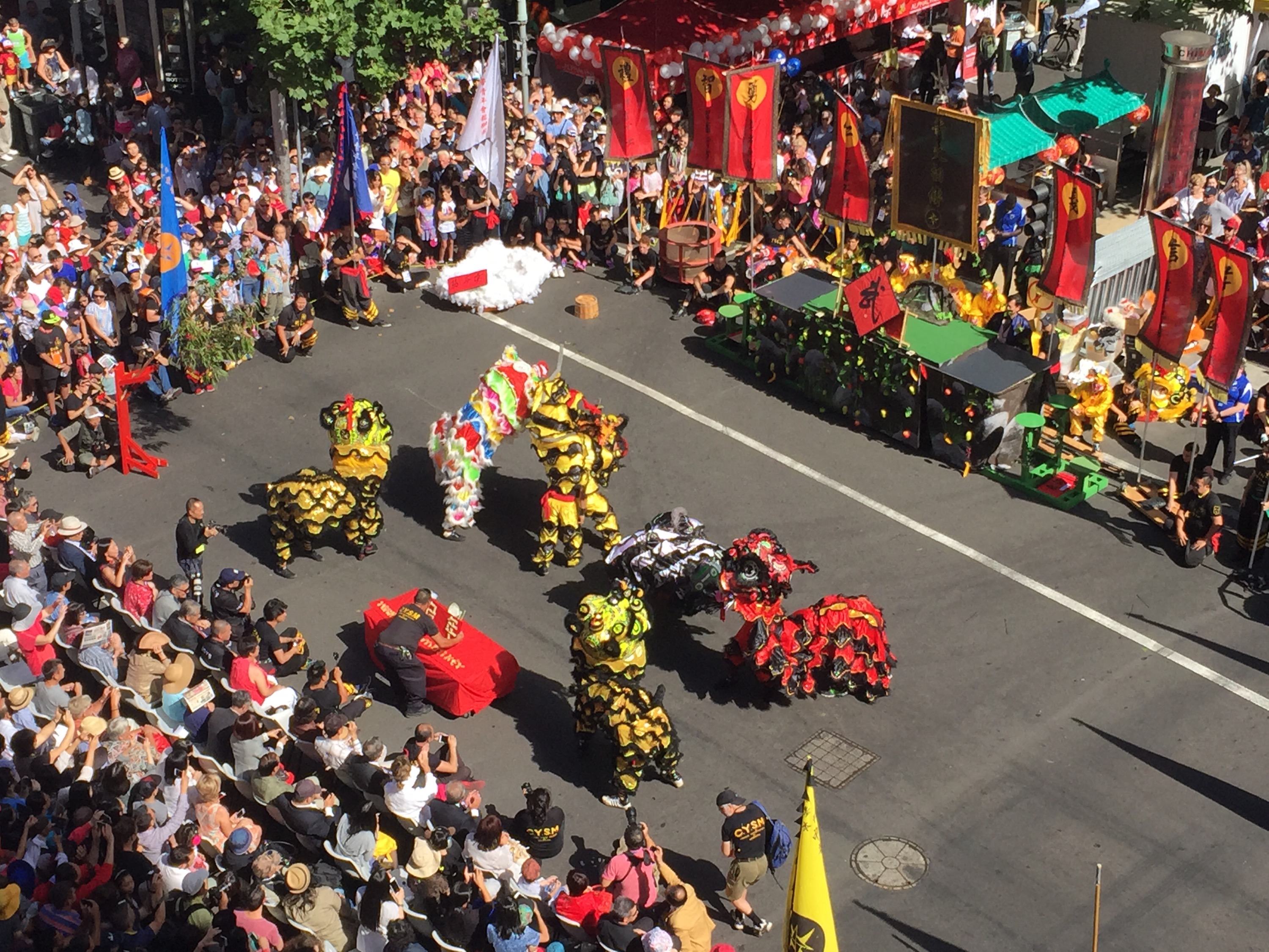 The atmosphere was electric and the crowd was thick. What I really liked was the fact that the lions would continue to dance in between shops rather than start and stop when one shop was done. Walk to the next available shop and start and stop again. As a spectator watching from the crowd it was just exciting. Another thing that I thought was cool which is very different to Sydney is the drum carts. They have massive drum carts. Like a drum cart where the drummer and drum is on a raised wheeled platform above the crowds. There were lots of banners streaming from the back informing everyone of which team was there.