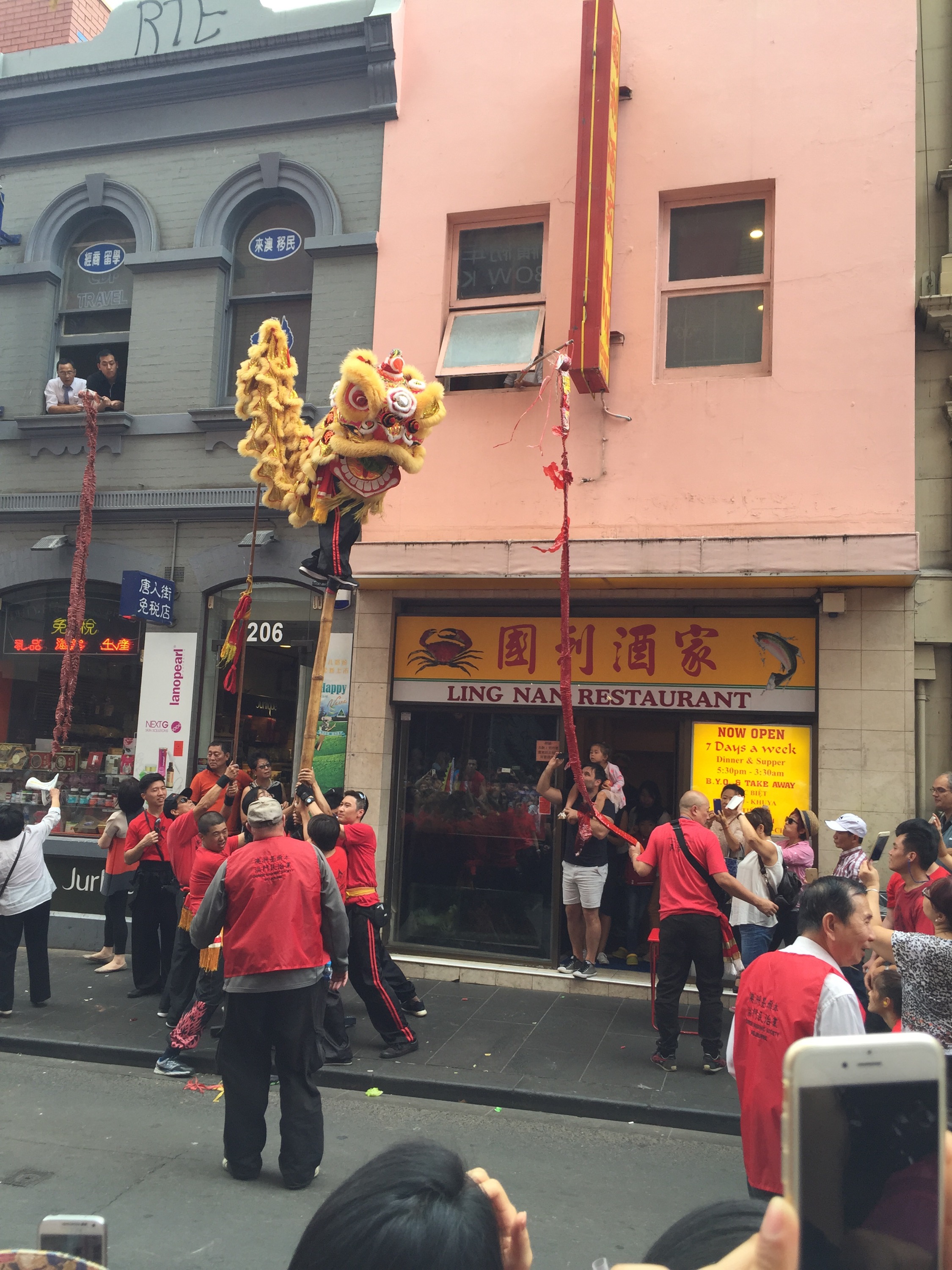 The other three teams split themselves up to go shop to shop dancing in Chinatown!! It was great. It felt like my childhood in Cabramatta when there wasn’t an affiliation between shops and lion dancing teams and the shops would just stick out a Cheng, somehow get their hot hands on a string of firecrackers and stick that out as well and the first team to come by gets served! It was madness!!! There was drumming and firecrackers everywhere. At one point I think I saw team A of CYSM performing next to team A of CMS performing next to team B of CYSM performing next to team B of CMS and in the distance firecrackers going off which could only be HGYS performing at a shop as well. Actually, I think to keep the peace and be more attractive I did notice shops keeping tab of which team had already performed for them so when another time walked by they would put another Cheng out.