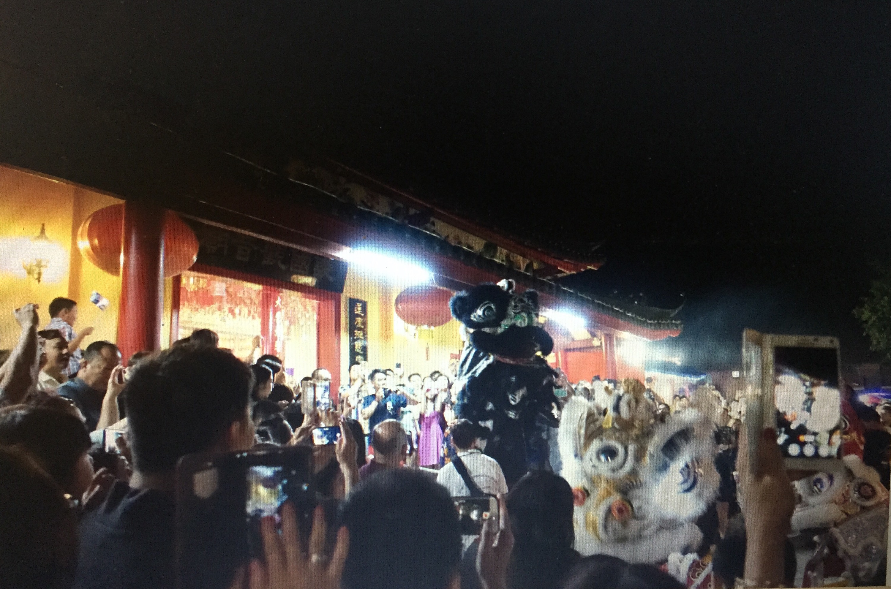 And as usual, about 10 minutes before the stroke of midnight, the lions reassemble themselves in front of the main temple hall. They dance in line whilst one of them choy cheng (timed to coincide just before midnight). The temple staff come out and light the million strings of firecrackers which is always exciting for my ears. (Maybe not for everyone who’s standing too close. It happens every year. Because it is a temple and private property, there’s not a lot of official looking council workers or pyrotechnic people shooing everyone to 100m away. You stand wherever you like and if you’re too close to the firecrackers you run or more like push your away to get away. All whilst pointing your camera at the firecrackers trying to live stream it, having your free hand blocking one ear and trying your best to raise your shoulder high enough to give some level hearing protection for your remaining ear). The firecrackers are used as a surrogate countdown to the new year because right afterwards, the fireworks go off. And I mean they go off. These guys don’t hold back. I’m usually a firecracker person and don’t find fireworks that exciting (you’d think that the world famous Sydney New Year fireworks over the harbour bridge every year would whet my appetite but nope). However, this is different. I think the combination of a great set of fireworks, the fact that it explodes so close over our heads and the Chinese temple facade in the foreground gives it such a great atmosphere.