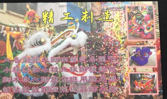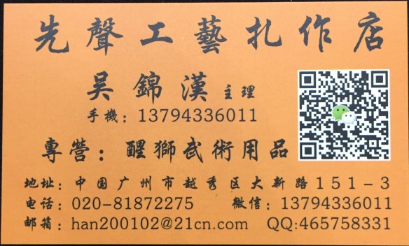 What they sell: Everything lion dance, dragon dance, unicorn dance related items. Lion heads- southern and northern lions, drums, gongs, cymbals, stands and carts, flags, dai tou fut, weapons, parts for lions (fur, beard, pom poms, eyes, mirrors etc).
