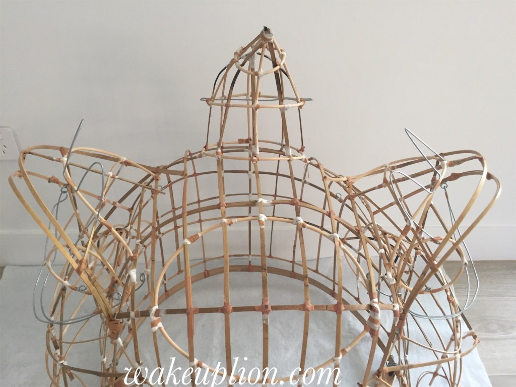 And that’s that. I’ve finished off attaching the wiring and I’m done with the frame. It’ll be onto papering soon. I must say, the whole process of making the frame including the wiring did not feel as tedious as it did in the past. I finished it fairly quickly and easily too. Some new things I’ve experimented with the process- rather than just cutting the bamboo pieces to length, I sized up each bamboo strip to where I was going to attach it on the frame to make sure the natural curve of the bamboo fit well. I utilised a lot more rattan cane than in the past. I also soaked the strips of cane I was going to turn into rings. This made bending the cane incredibly easy and none of them snapped in the process. I used a combination of micropore tape (for lightness) bind the strips together and used a small strip of rigid brown sports tape right at the end to secure the micropore tape. I think the adhesive on the sports tape is superior and hopefully will last for the ages. Overall, the lion feels light and sturdy and the shape is less lopsided that previous.