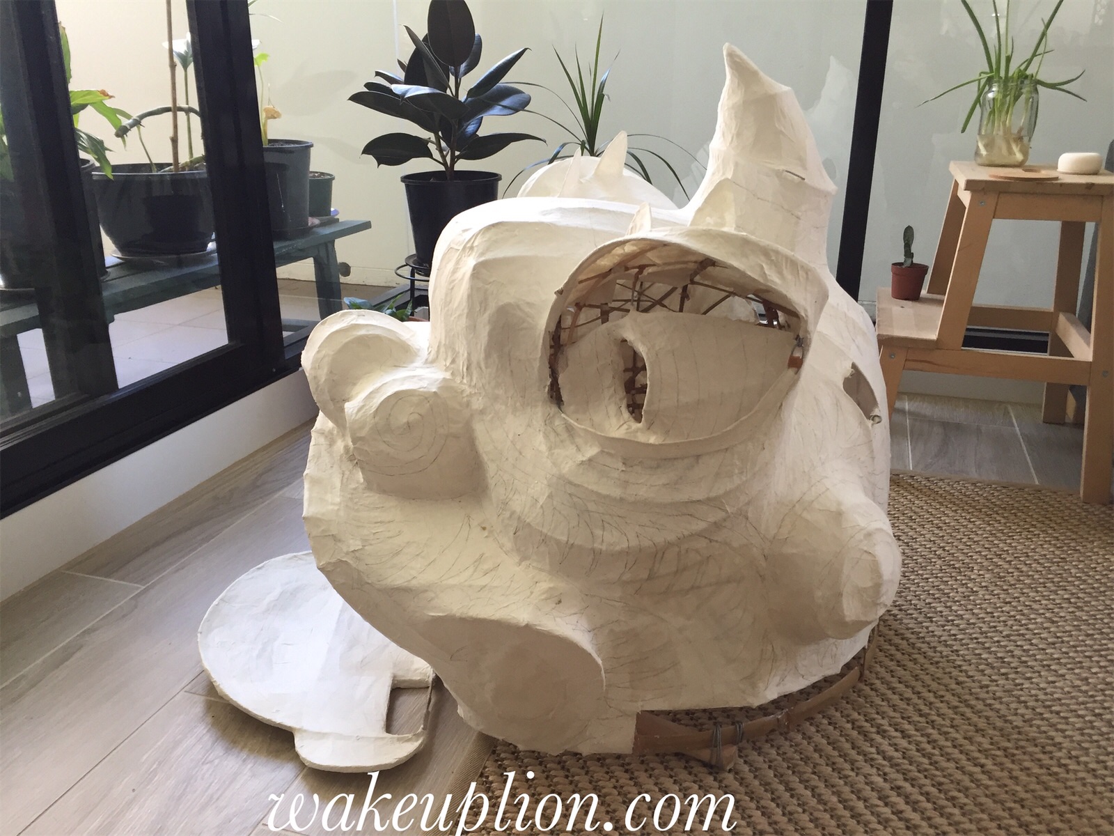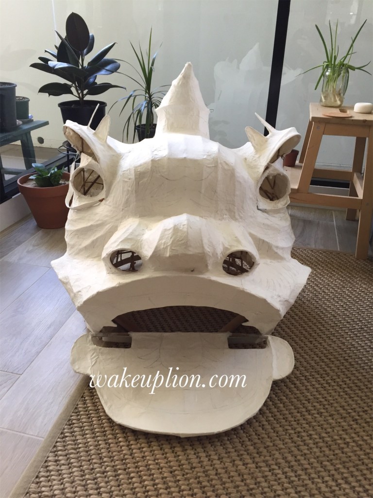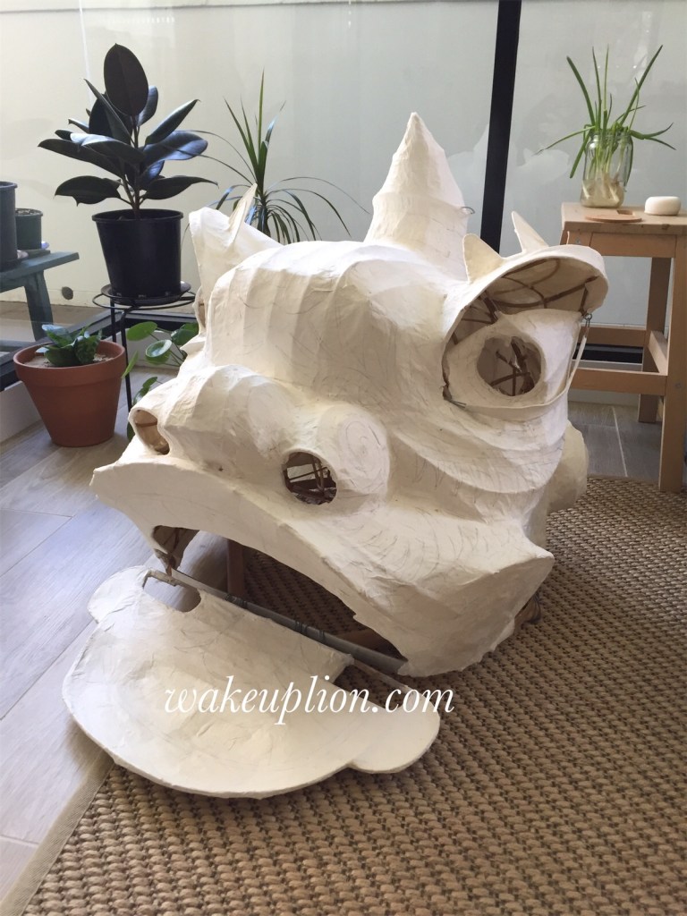 A bit of a lag between my last efforts and now. I’ve finished off papering the lion and putting on the designs. I’ve decided to go with a red/ gold/ yellow design for this one. Trying to get the colour scheme and design is tough though. I’ve been pouring through images of Luo An Kee lions and I’m loving the two tone base as well as the designs. So intricate but alas, I’m going to pass on anything too intricate. My brushwork isn’t quite there yet but maybe the next lion after this will be a Luo An Kee lion- complete with the frame made to the specs that Chris Low has in his book. I can’t wait to get cracking on completing this head.