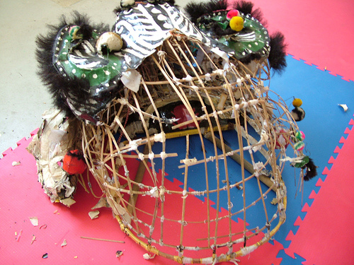 It was mixed feeling when we started to strip the lion head of its old paper mached skin. It felt good pulling off layers and layers of medical tape. But when we finally got to the frame, the amount of damage to the bamboo frame was overwhelming. Almost every piece of bamboo in that lion head was broken somewhere down the line and most joints were loose.
