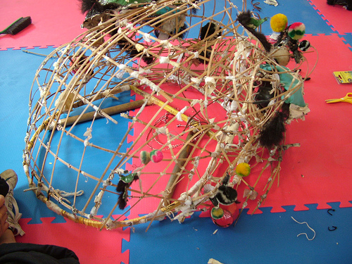 Nonetheless we pushed on. The first trouble we had was working out how to bind the joints together. We tried using twine tied using knots but that failed as the binding was either too loose or the knots started coming undone. Then we tried using twine dipped in PVC glue which didn’t work followed by twine with the ends tacked on with a hot glue gun which …. Didn’t work either. We did end up tying most of the simple joints with twine knotted together as a temporary measure.