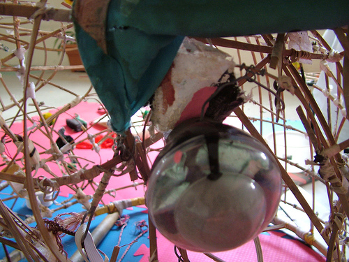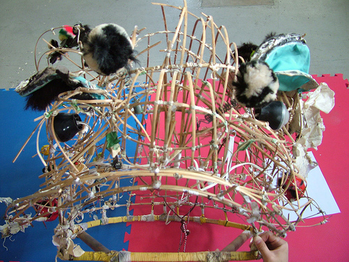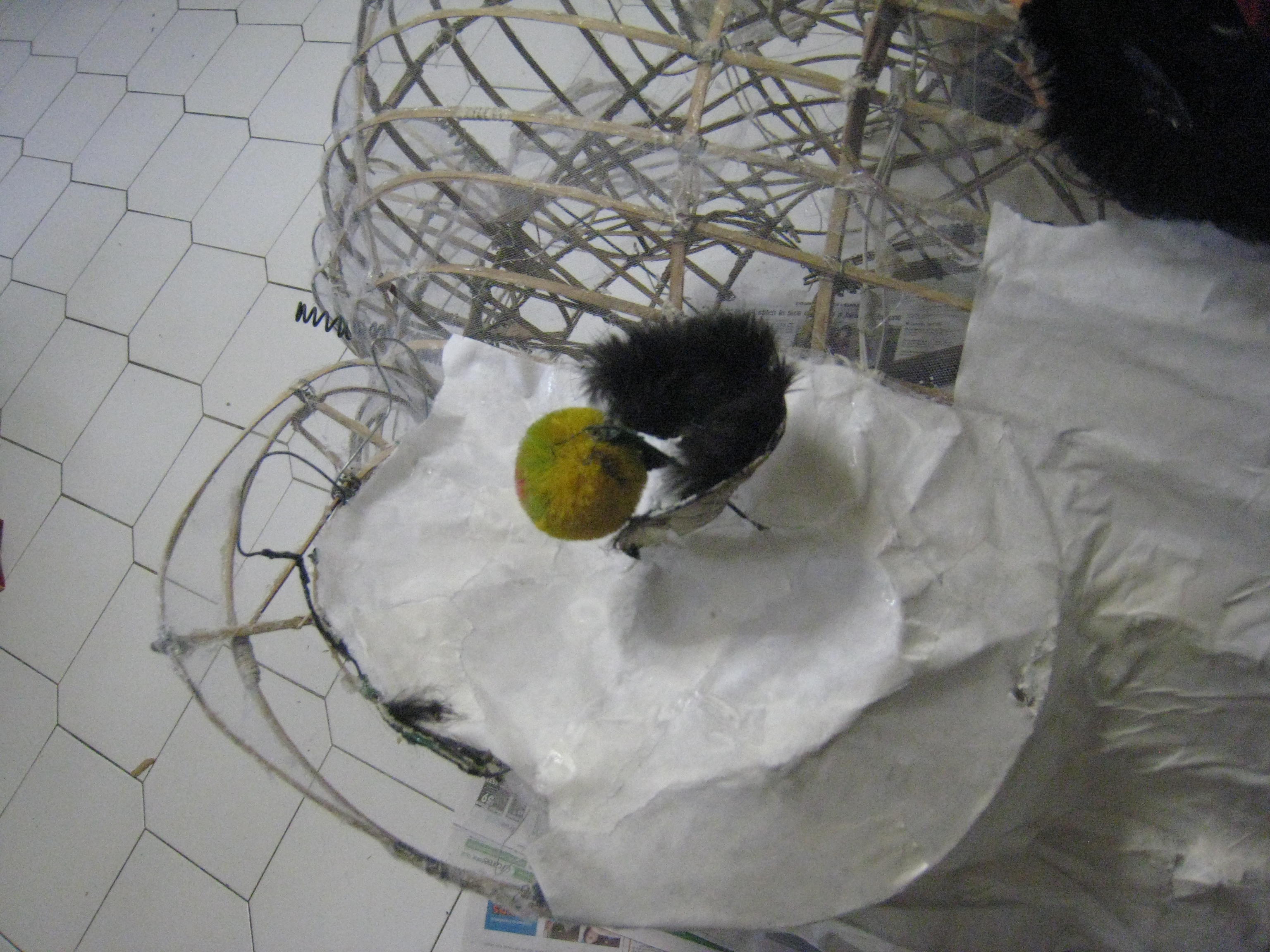 My SiJe enlisted my help with the project and gathered a few extra bits which we needed – new bristle fur, new pom poms, rabbit pelts, mirrors and of course bamboo strips.