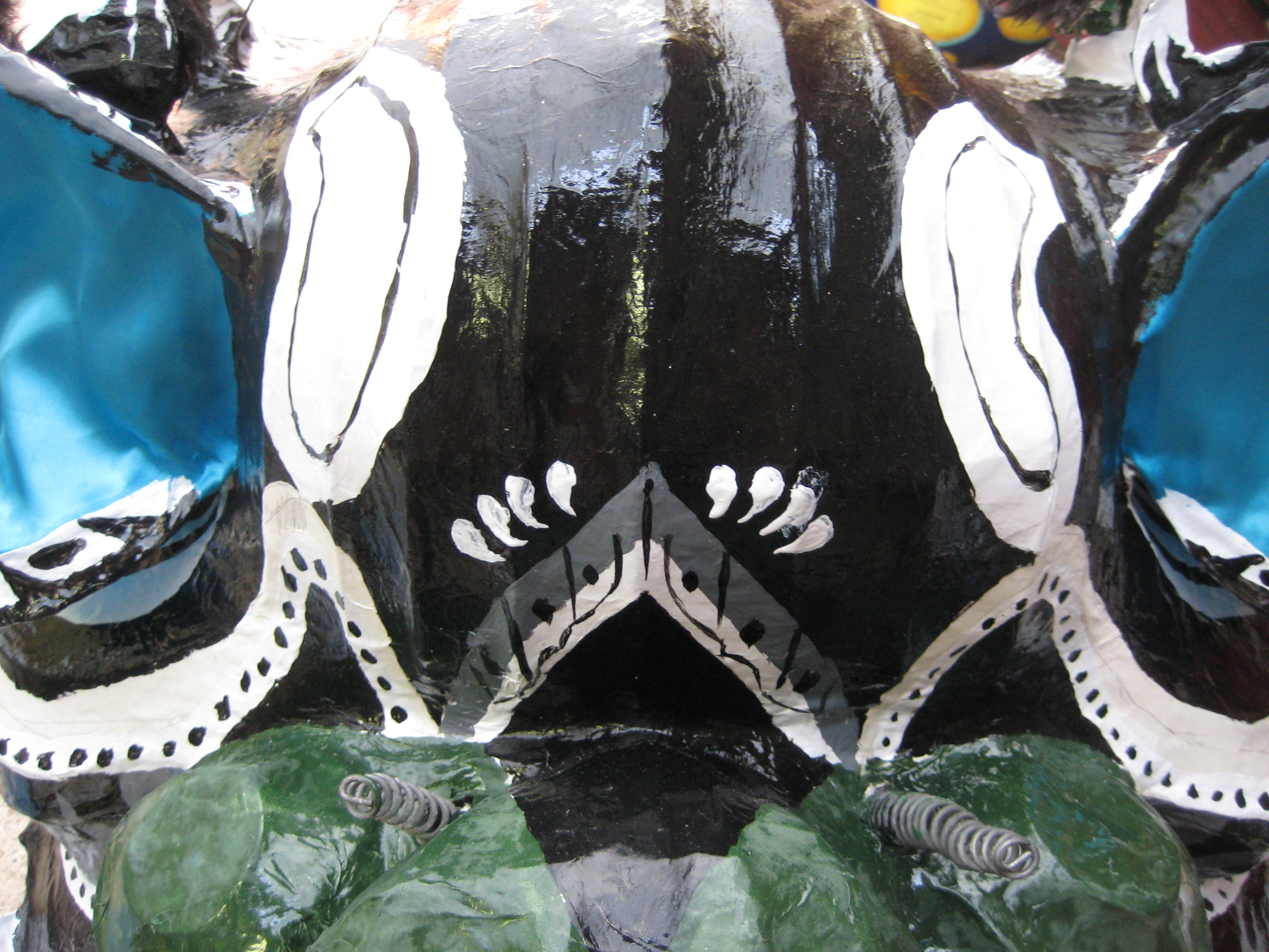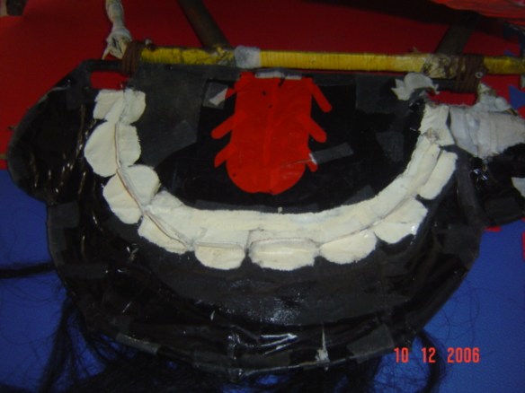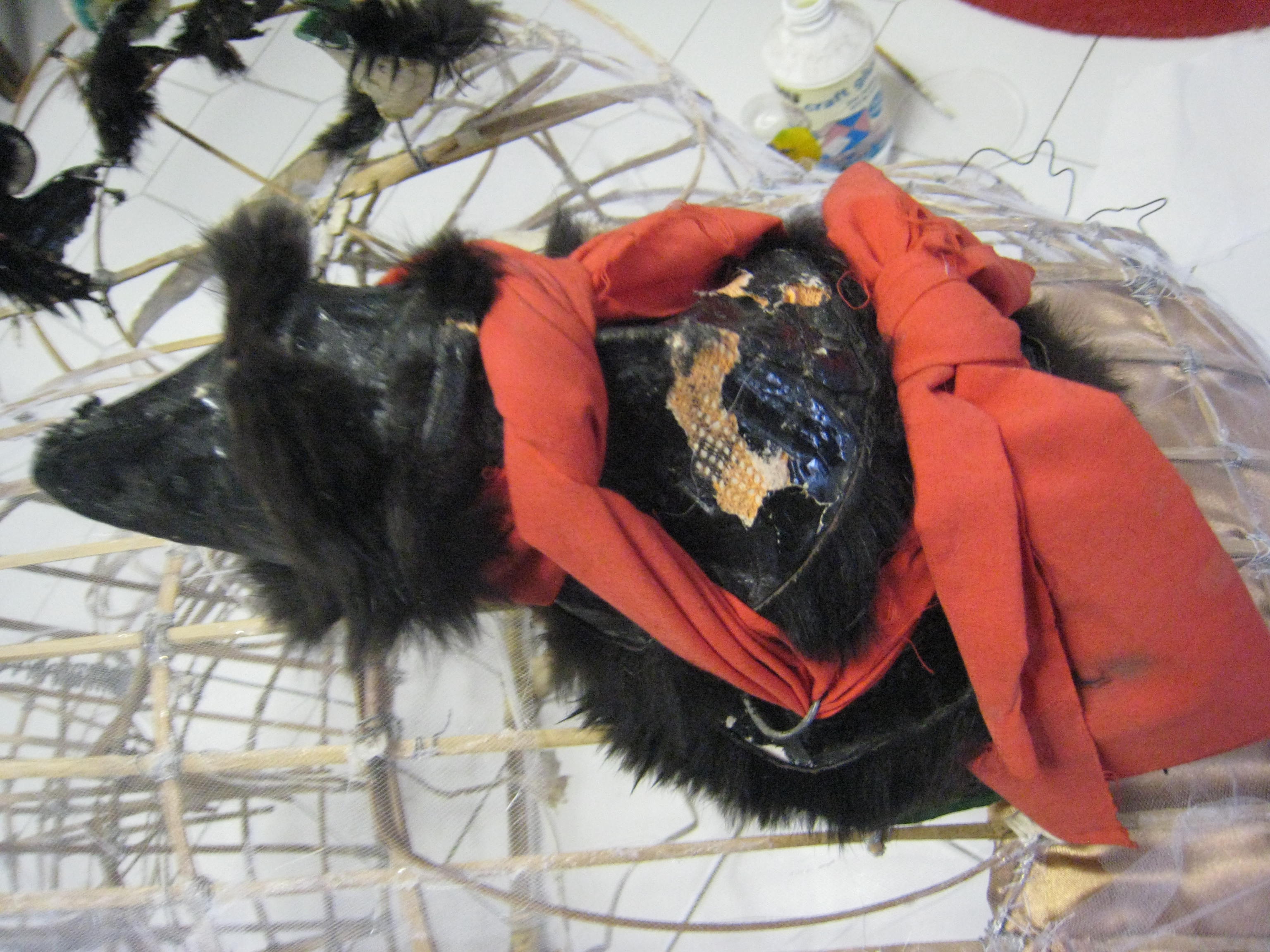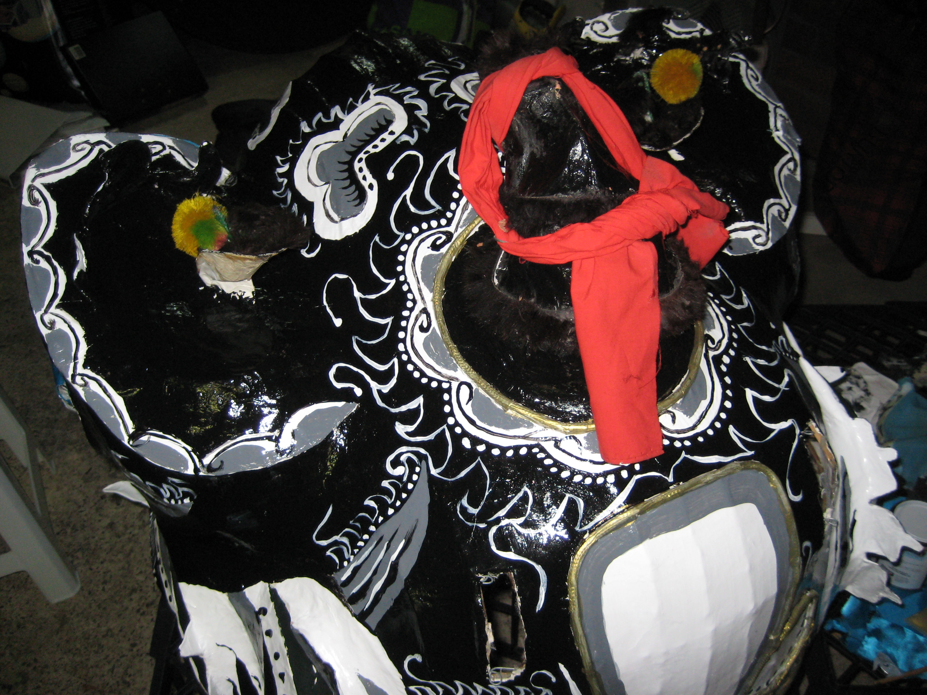 I wanted to keep some of the features of the old head intact to remind us of the history of the lion, so I left the horn and eyes intact in their original state. The horn’s paper mache is still its original and what fur remained from the original I left on ( complete with old firecracker paper stuck in it).