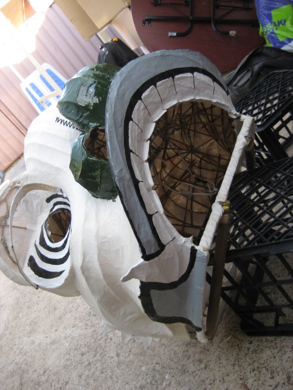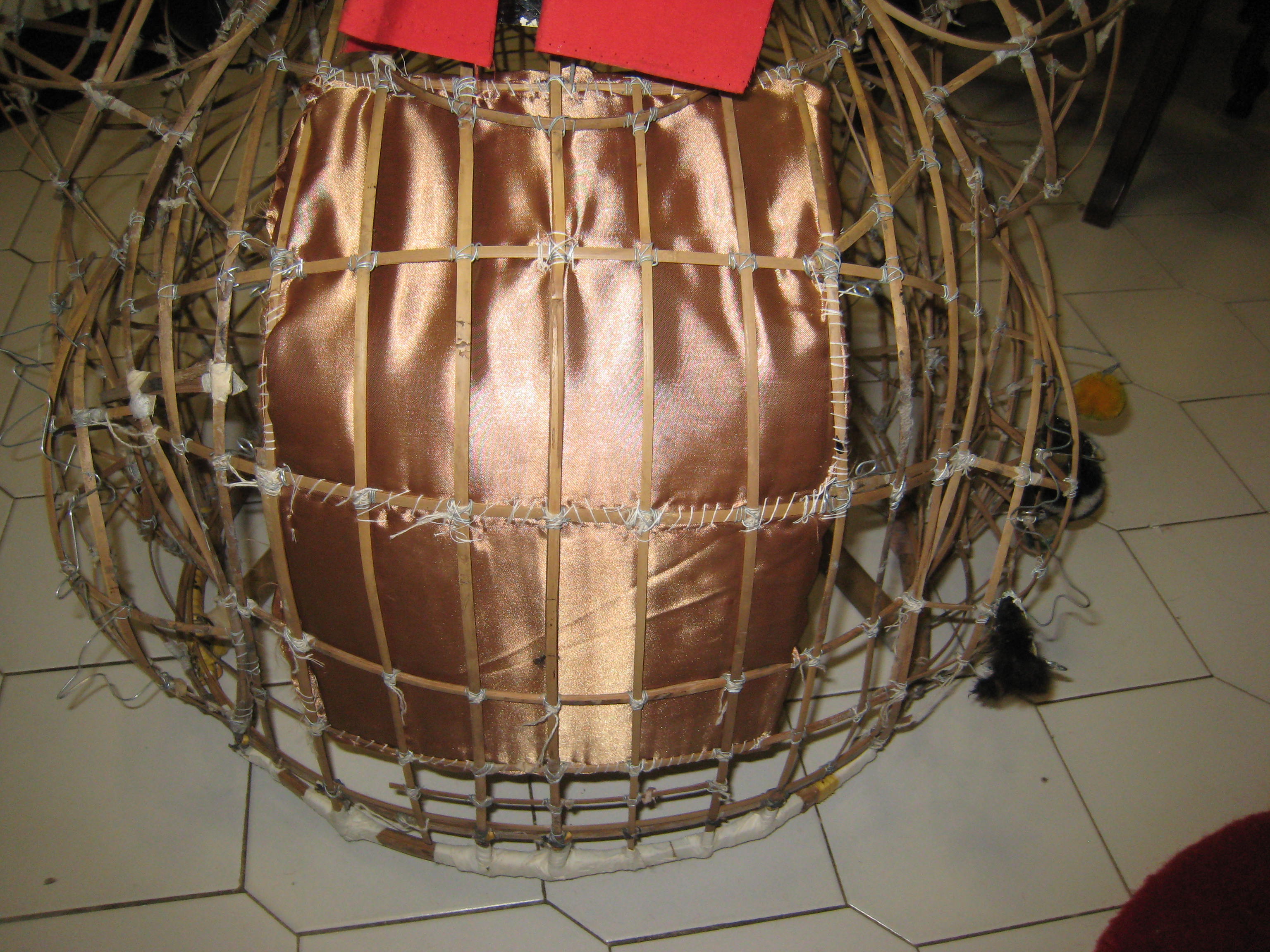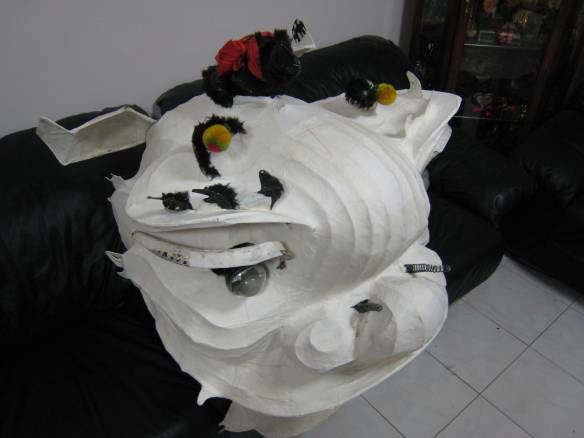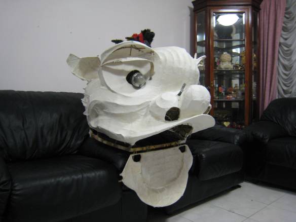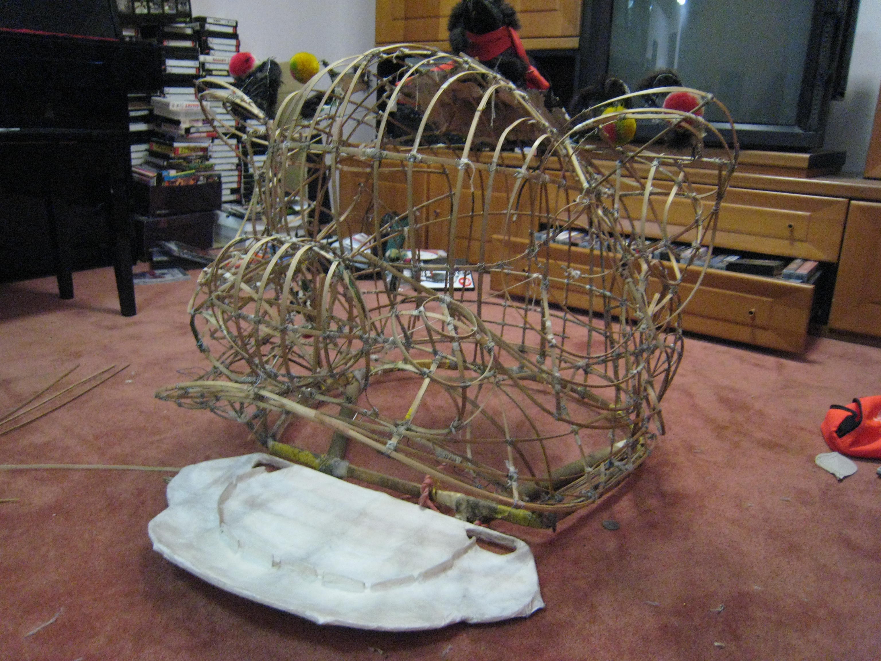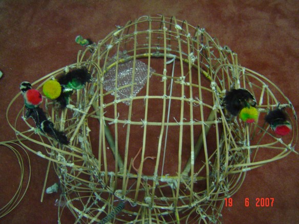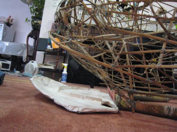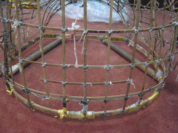 There was a minor delay in progress towards the end of fixing up the frame. I thought that the head was still a bit squashed ( I felt it was leaning too far forward with the top lip of the mouth too horizontal (like a hok san mouth) so I undid a fair bit of the bindings to readjust the bamboo strips that were connected to the base to prop up the front of the head a bit more.