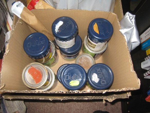 So I wander over there and low and behold, there are about 100 pots of unwanted paint sitting there on sale a $2 a pot. The only catch is that you have to open every single one of them to check out what colour is lurking beneath which was a fun exercise in itself.